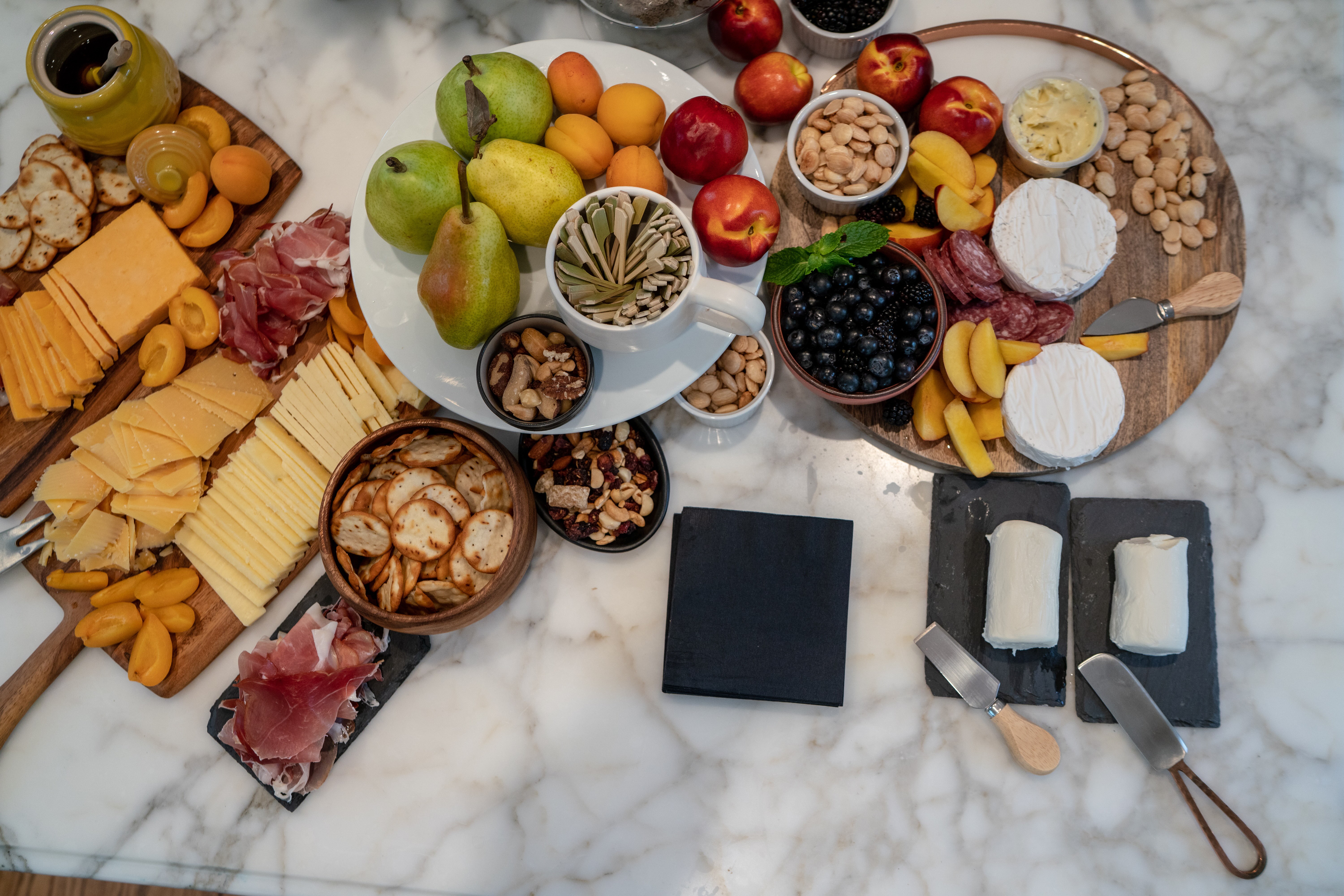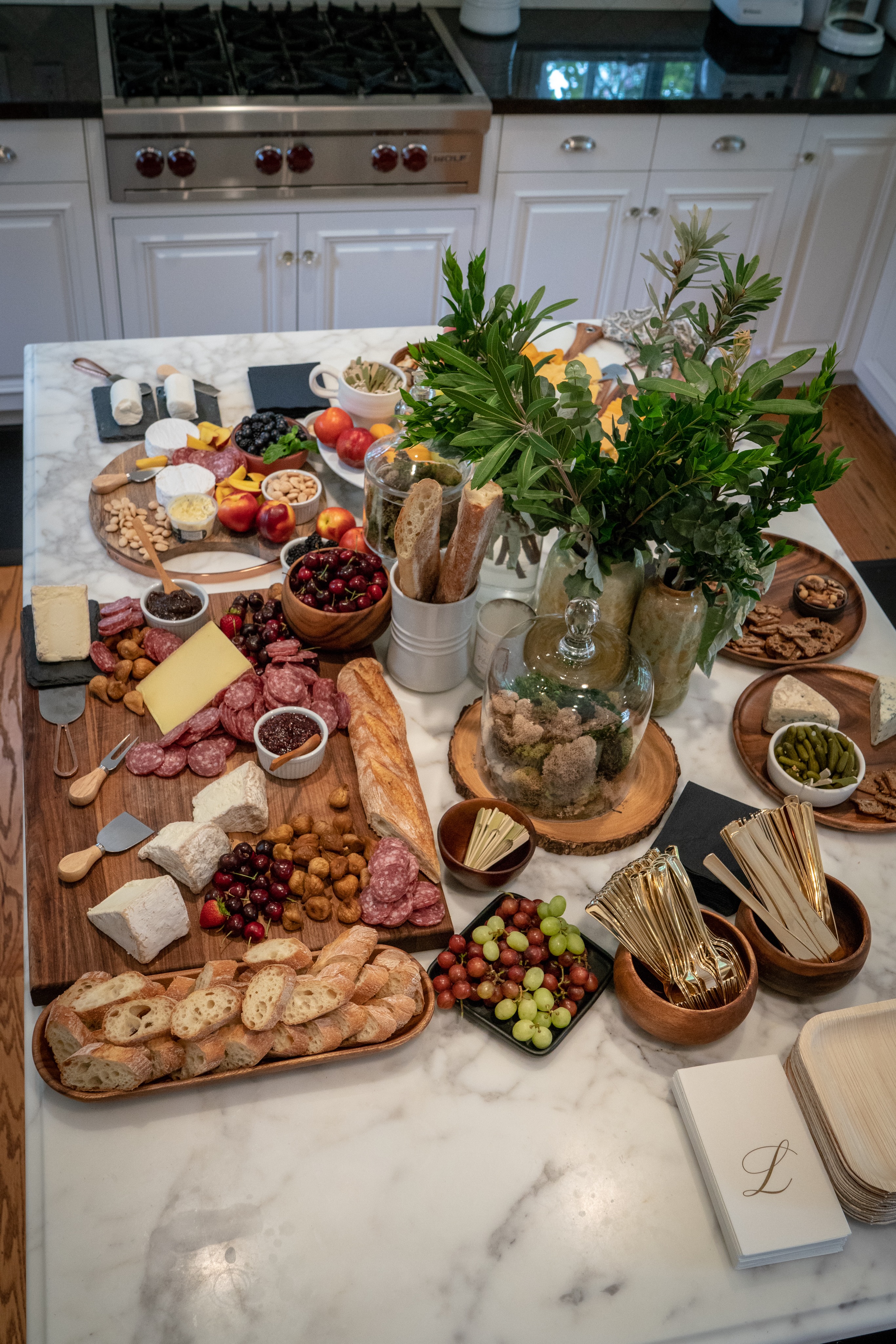 Having company over means gathering friends and family together to be social and have fun! Instead of a formal sit down dinner, I love converting my kitchen island into a “grazing” hub with different themed stations. This particular event was my son’s 4th birthday party. I wanted parents (and kids) to have the option of choosing from pizza and popcorn and a buffet of themed fruit, nut and cheese boards. Some parents hung out all day here and never left!