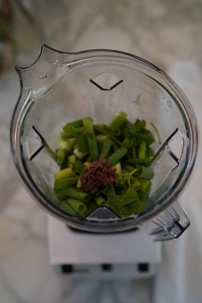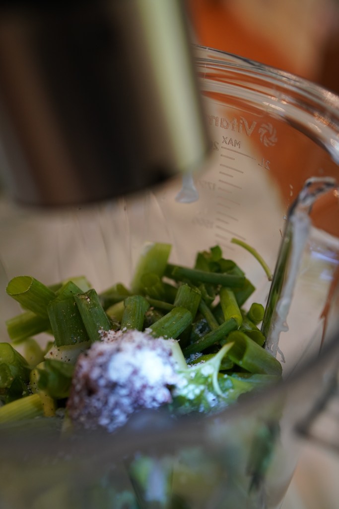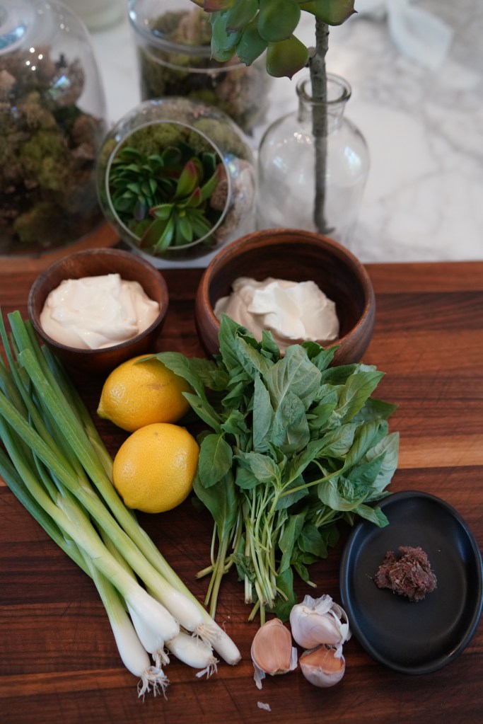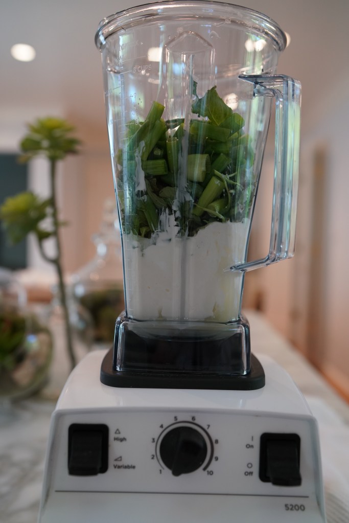 To a blender in this order, add lemon juice, 1 cup mayonnaise, 1 cup sour cream, garlic, basil/green onions and 3 anchovies. Add 1 tsp kosher salt and freshly cracked pepper.