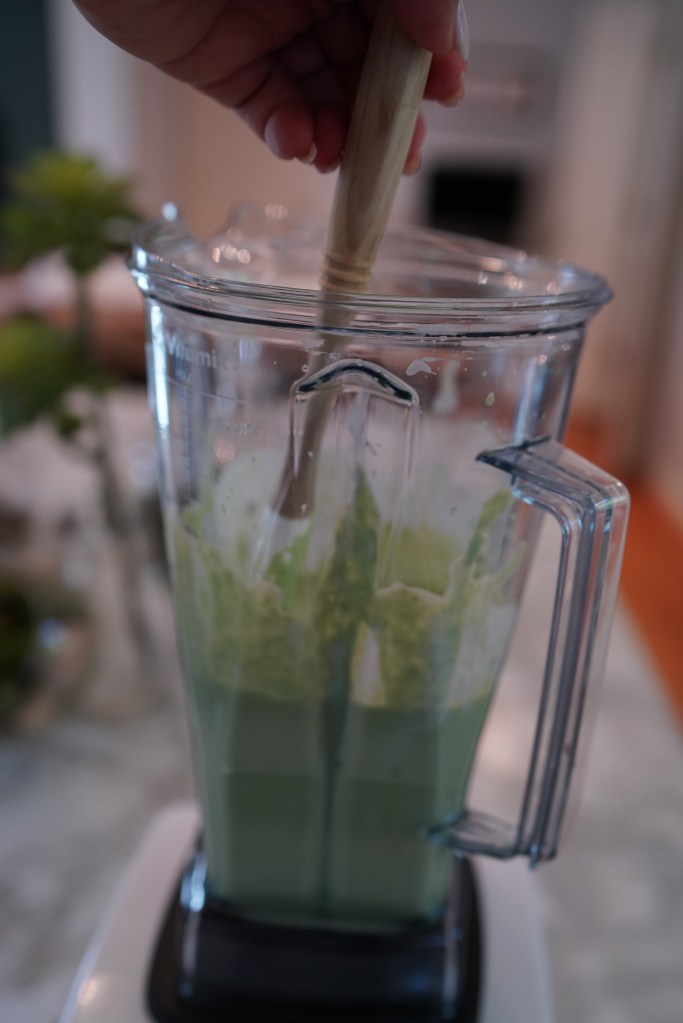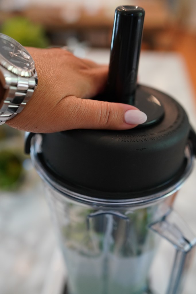 Seal lid and if your blender has one, use rod to press ingredients down as you blend. This will help the blending process. Pause after 15 seconds, turn off the blender and, using a spatula, scrape down the sides to ensure all ingredients are incorporated. Blend for a final 15-20 seconds.