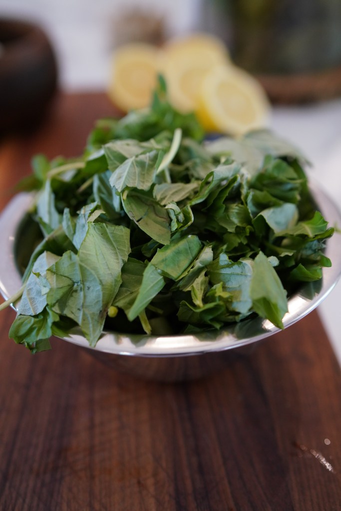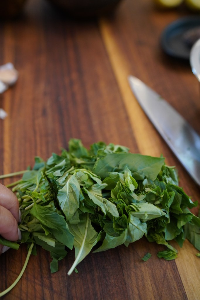 Rolling basil into a ball, rough cut to yield 1 cup and set aside.