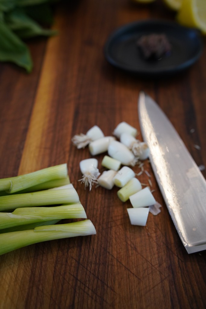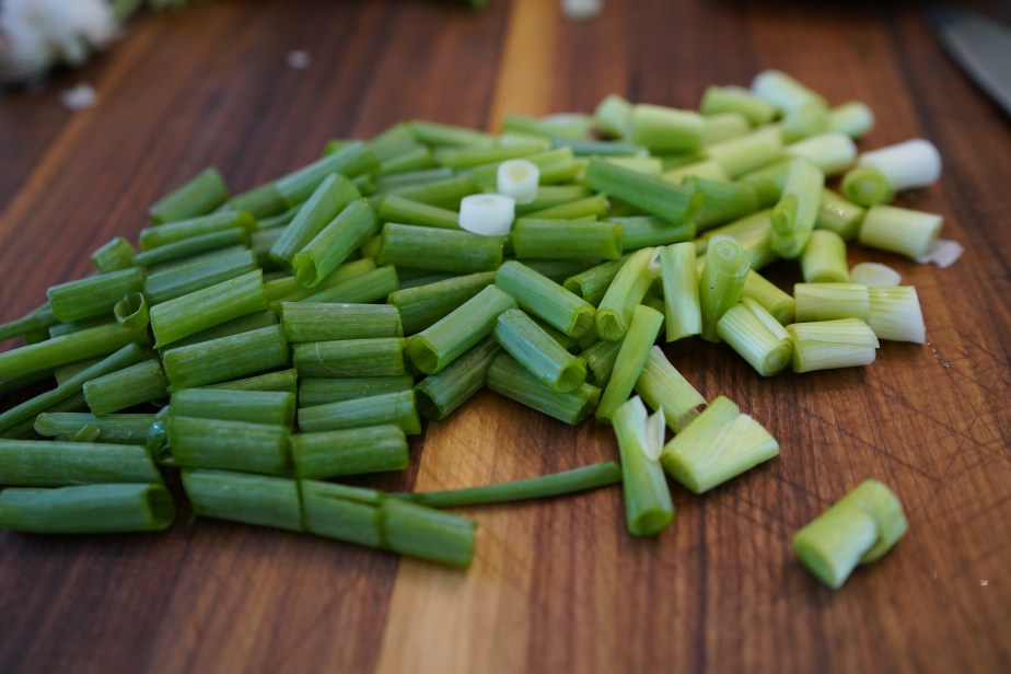 Rough cut white and green parts of green onions to yield 1 cup and set aside.