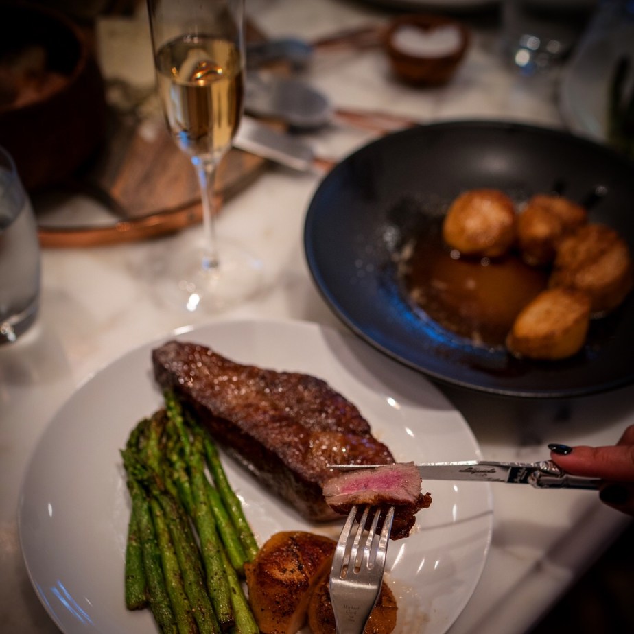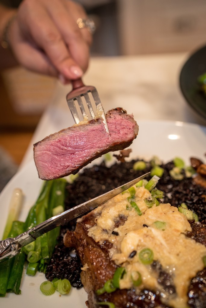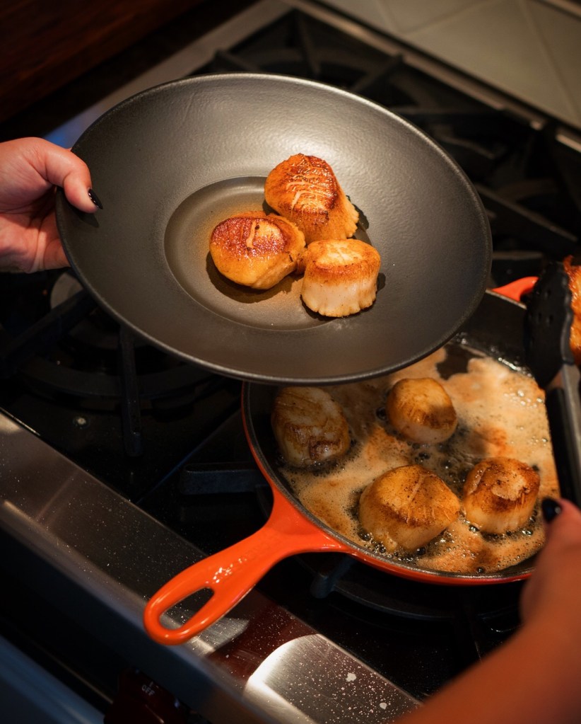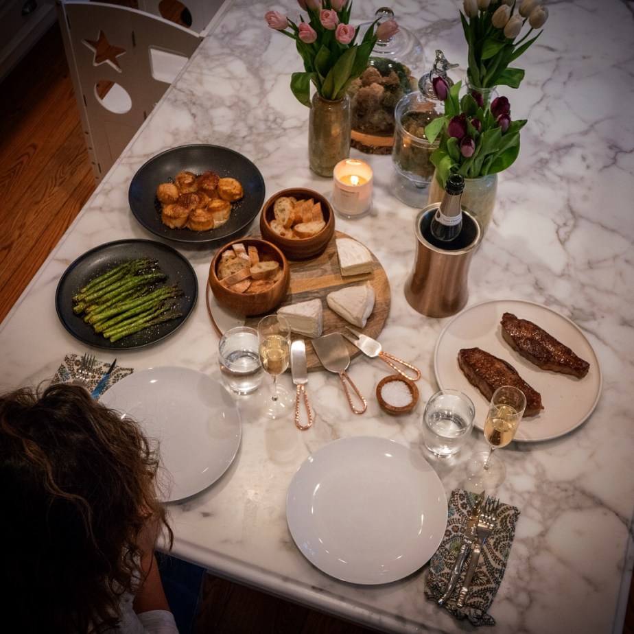 I love having romantic dinners at home with my husband for “date nights”. Time can be spent focusing on the food and its careful preparation rather than trying to rush a meal to the table to satiate a hungry toddler. I was fortunate to have an extra set of hands to film for the below date night and that made all the difference thanks to my lovely husband! On the menu was all of his favorites…seared steak, fennel salad with shrimp & tarragon oil, butter braised scallops and caramelized asparagus. A quick, simple and easy dinner for two hungry people!